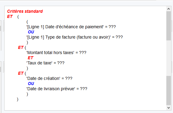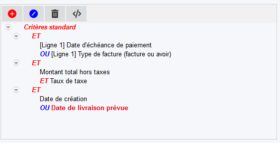 (Critères standard) ET ( '[Ligne 1] Date d'échéance de paiement' OU '[Ligne 1] Type de facture (facture ou avoir)') ET (createDate OU deliveryDate) ET (amountHT ET taxRate)
