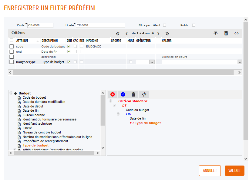 - Filtre par défaut : A cocher pour que ce filtre soit appliqué à l'ouverture de la fonctionnalité.