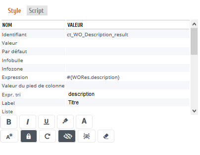 Modifier la police du champ ou de la colonne. Respectivement : couleur, gras, souligné, italique. Modifier la couleur de fond du contrôle. Rendre le champ sélectionné obligatoire (ou de nouveau non obligatoire, s'il avait été rendu obligatoire précédemment : vous ne pouvez pas rendre non obligatoire un champ initialement obligatoire). Afficher tous les contrôles, y compris ceux masqués. Masquer (ou ré-afficher) le champ ou la colonne sélectionnée. Rendre le champ non modifiable. Rafraîchir les champs liés lorsque la valeur du champ est modifiée (ajax). A utiliser en cas de script. Annuler toutes les modifications de personnalisation effectuées sur le contrôle sélectionné. Annuler toutes les modifications de personnalisation du formulaire (lorsqu'aucun contrôle n'est sélectionné). Supprimer un contrôle ajouté en personnalisation. |