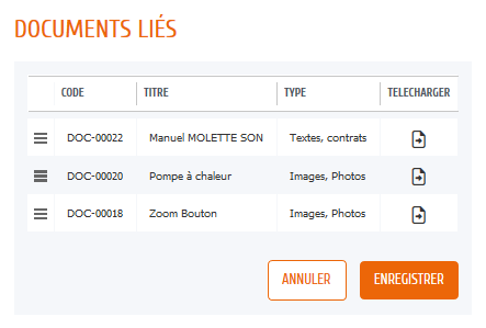 Il permet de consulter l'ensemble des documents liés associés à l'entité mais également de modifier l'ordre d'affichage des documents dans le bloc "Documents Liés".